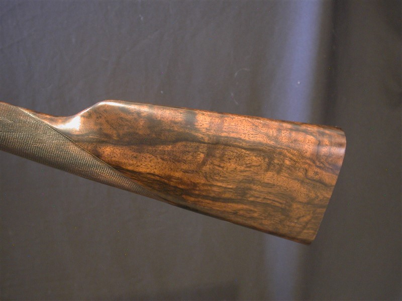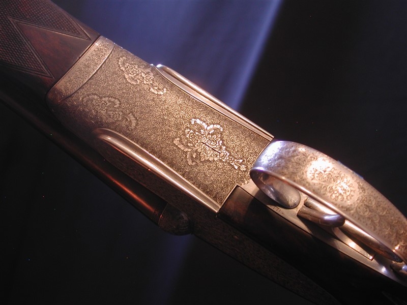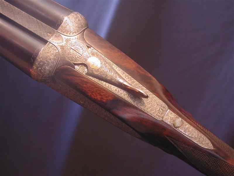 PIOTTI, ITALY, 12 bore, King 1, c.1981, 2 3/4", 27", concave matte rib, choked IC/Mod. 14 5/8" highly figured wood to checkered butt. Coin finished receiver with full coverage Granetti fine scroll engraving. Gold inlays include - crown inlay in top lever and in semi beavertail forend, Piotti name on action and the number 1 on the barrels. Double triggers - front articulated. 6 1/2lbs |