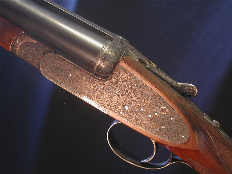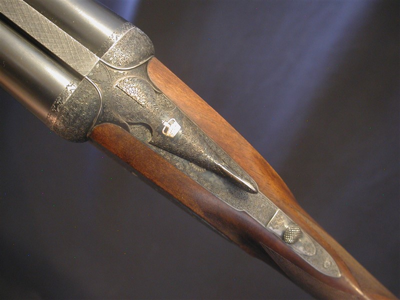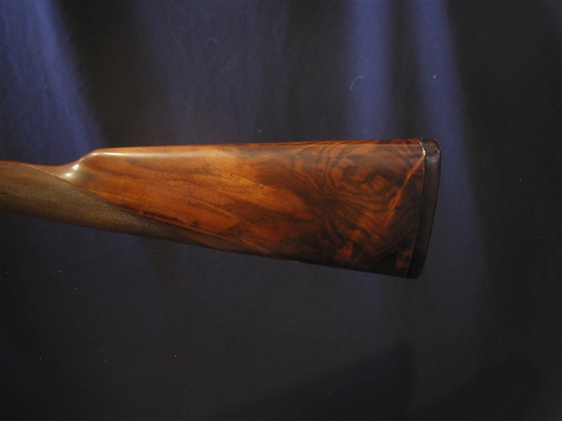 PIOTTI, ITALY, 20 bore, King 1, c.1981, 3" chambers. 28" choked IC/Mod. 14 5/8" highly figured wood to leather covered pad. Semi beaver tail forend with gold crest, single trigger. Action retails virtually all its original case colors, Piotti name in gold on a full coverage fine scroll Granetti engraved action. 6lbs 6oz in makers case. Excellent condition. |