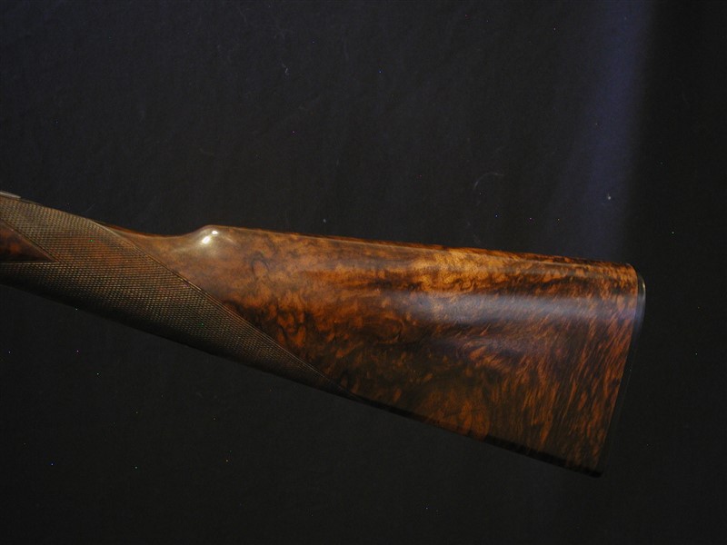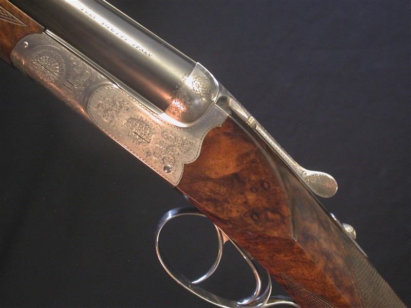 PIOTTI, ITALY, 28 bore, BSEE, c.2000, 2 3/4", 28" choked IC/Mod. 14 1/2", diamond grip highly figured wood to horn butt plate. Elegant scroll back, coin finished receiver with fine English rose and scroll engraved by Granetti. 5lbs 12oz. A fine little 28 bore in excellent condition. |
