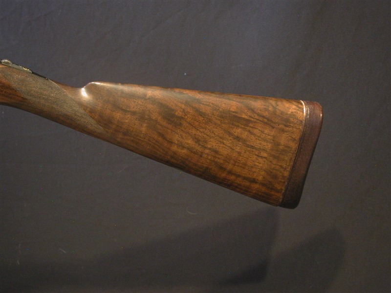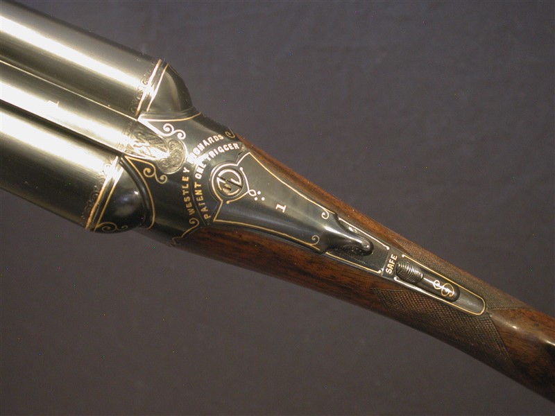 WESTLEY RICHARDS, LONDON, Drop Lock Ejector. c. 1908. 2 3/4". A very unique Funeral Model. Owner claims it to be one of a kind (Two actually - its #1 of a pair) see images. 28" choked IC/Sk2. 14 3/8" moderately figured wood to leather covered pad. Action is blacked with fine gold line inlays decorating the action, furniture and screw heads. Single selective trigger. 6lbs 9oz. Facinating gun to say the least. |