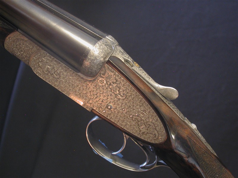 PIOTTI, ITALY, 12 bore, King 1, c.1981, 2 3/4", 27", concave matte rib, choked IC/Mod. 14 5/8" highly figured wood to checkered butt. Coin finished receiver with full coverage Granetti fine scroll engraving. Gold inlays include - crown inlay in top lever and in semi beavertail forend, Piotti name on action and the number 1 on the barrels. Double triggers - front articulated. 6 1/2lbs |