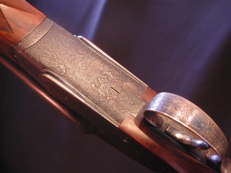 PIOTTI, ITALY, 20 bore, King 1, c.1981, 3" chambers. 28" choked IC/Mod. 14 5/8" highly figured wood to leather covered pad. Semi beaver tail forend with gold crest, single trigger. Action retails virtually all its original case colors, Piotti name in gold on a full coverage fine scroll Granetti engraved action. 6lbs 6oz in makers case. Excellent condition. |