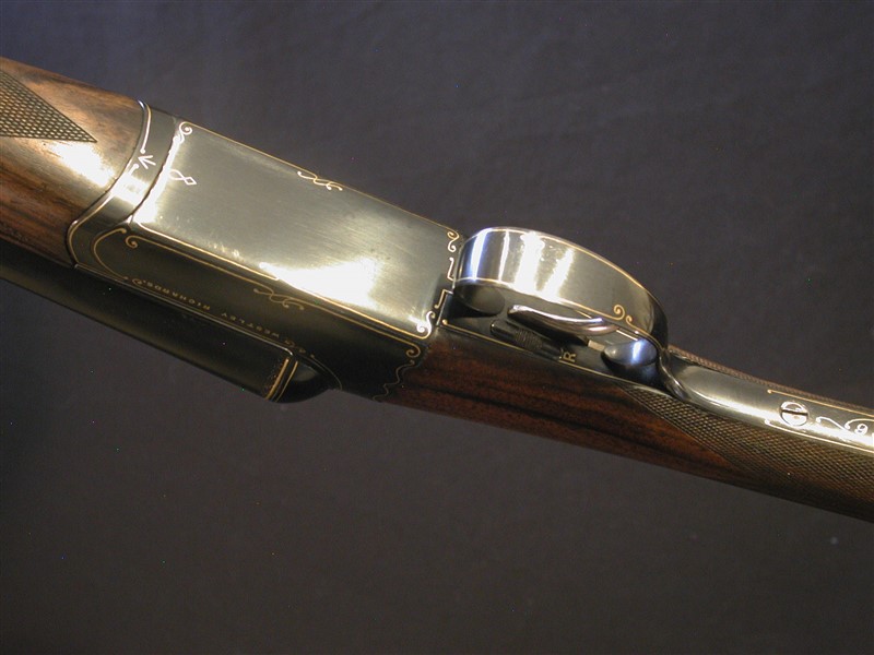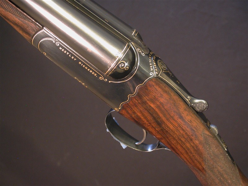 WESTLEY RICHARDS, LONDON, Drop Lock Ejector. c. 1908. 2 3/4". A very unique Funeral Model. Owner claims it to be one of a kind (Two actually - its #1 of a pair) see images. 28" choked IC/Sk2. 14 3/8" moderately figured wood to leather covered pad. Action is blacked with fine gold line inlays decorating the action, furniture and screw heads. Single selective trigger. 6lbs 9oz. Facinating gun to say the least. |